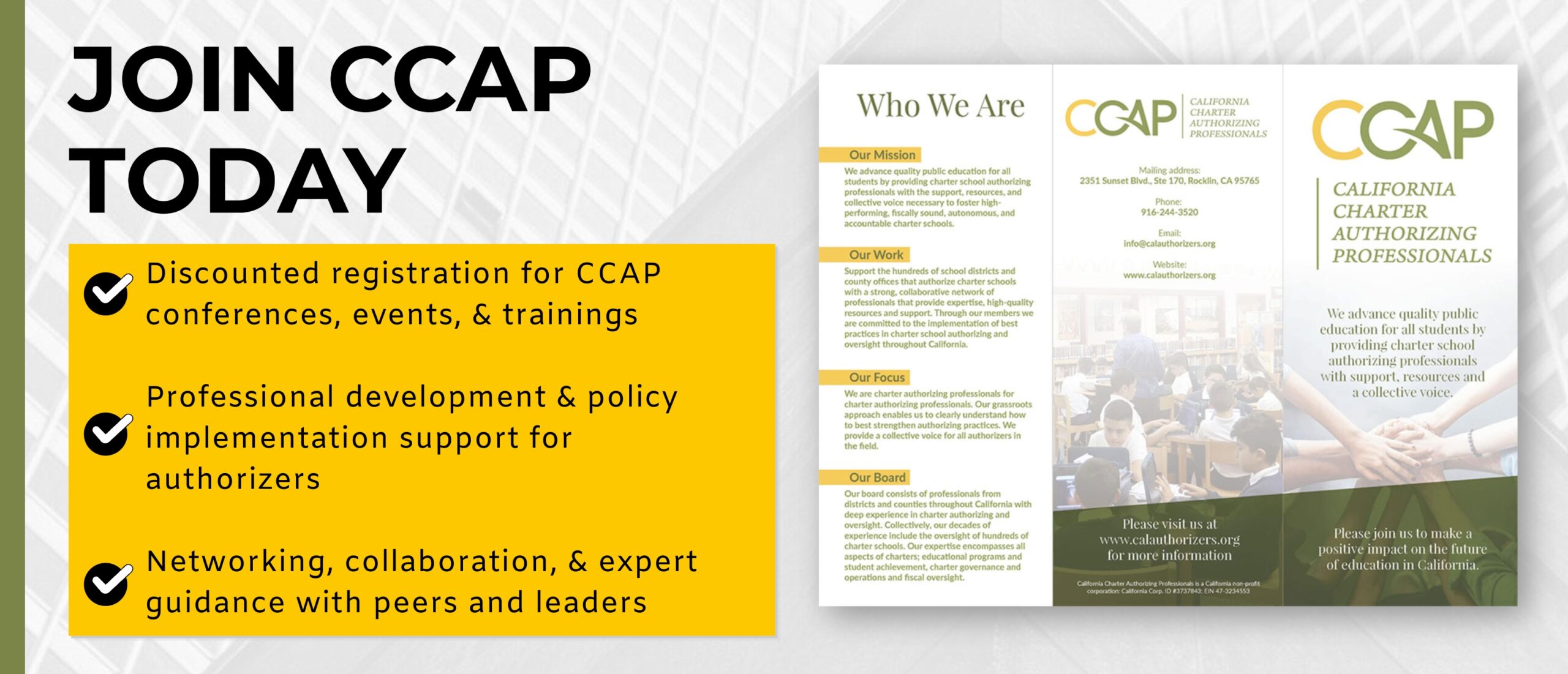 CCAP is working to ensure quality charter schools in California’s public education sector by providing a network of support and resources to build the professional capacity of the individuals serving this vital role. We invite you to be a part of this important work by joining CCAP and supporting our mission. Together we can and will make a positive impact on the future of education in our state.